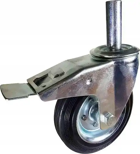 Opis przedmiotu: |||Nazwa:Zestaw kołowy skrętny z hamulcem mocowany na trzpień gładki, wykonany z tłoczonej blachy stalowej oraz koła z piastą stalową i opony z pełnej, czarnej gumy. |||Ilość sprzedawana: 1 szt. |||Średnica koła: 200 mm |||Szerokość bieżni: 27 mm |||Typ łożyska: wałeczkowe |||Średnica zewnętrzna trzpienia: 25×80 mm |||Średnica otworu:47 mm |||Wysokość całkowita: 300 mm |||Waga jednostkowa: 3,65 kg |||Nośność: 230 kg Mocowanie: Tłoczona blacha stalowa ocynkowana, w głowicy skrętnej z podwójnym łożyskowaniem kulkowym z uszczelnieniem głowicy. Koło: Czarna standardowa pełna gumowa opona, stalowa piasta z tłoczonej blachy, łożysko wałeczkowe.