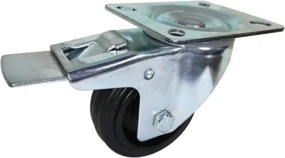 Opis przedmiotu: |||Nazwa: Zestaw kołowy skrętny z hamulcem |||Ilość sprzedawana: 1 szt. |||Średnica koła: 200 mm |||Szerokość bieżni: 27 mm |||Typ łożyska: ślizgowe |||Wymiar płytki: 135×113 mm |||Rozstaw otworów: 105×80 mm |||Średnica otworów: 10,5 mm |||Wysięg: 47 mm |||Wysokość całkowita: 237 mm |||Waga jednostkowa: 3,60 kg |||Nośność: 230 kg Mocowanie: Tłoczona blacha stalowa ocynkowana, w głowicy skrętnej z podwójnym łożyskowaniem kulkowym z uszczelnieniem głowicy. Koło:Czarna standardowa pełna guma z polipropylenową czarną piastą.