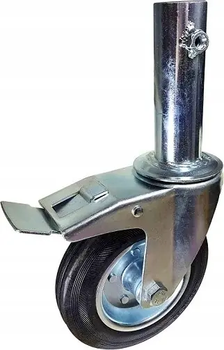 Opis przedmiotu: |||Nazwa:Zestaw kołowy skrętny z hamulcem mocowany na trzpień gładki, wykonany z tłoczonej blachy stalowej oraz koła z piastą stalową i opony z pełnej, czarnej gumy. |||Ilość sprzedawana: 1 szt. |||Średnica koła: 160 mm |||Szerokość bieżni: 25 mm |||Typ łożyska: wałeczkowe |||Średnica zewnętrzna trzpienia: 45×130 mm |||Średnica otworu:43 mm |||Wysokość całkowita: 350 mm |||Waga jednostkowa: 2,55 kg |||Nośność: 150 kg Mocowanie: Tłoczona blacha stalowa ocynkowana, w głowicy skrętnej z podwójnym łożyskowaniem kulkowym z uszczelnieniem głowicy. Koło: Czarna standardowa pełna gumowa opona, stalowa piasta z tłoczonej blachy, łożysko wałeczkowe.