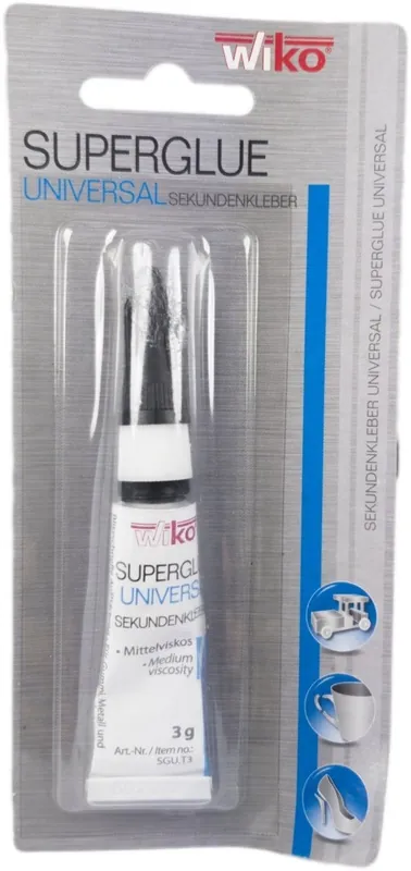 SUPER GLUE 140 |||Szybkie utwardzenie w mniej niż 5 sekund. |||Do gumy, metali i tworzyw sztucznych. |||Uniwersalne zastosowanie Stosowanie do materiałów sztucznych: •••Stosowanie do gumy: •••Stosowanie do metali: ••Stosowanie do materiałów porowatych: ••Wytrzymałość temperaturowa: -40 °C do +85 °C Lepkość: 70 – 90 mPas Opis Kleje UNIWERSALNE WIKO SUPER GLUE łączą nie tylko tworzywa sztuczne, gumę i metal ale również porowate i chłonne materiały, jak drewno, papier, korek, skóra, ceramika i inne. Kleje UNIWERSALNE WIKO SUPER GLUE tworzą szybkie, czyste i prawie niewidoczne połączenie. Właściwości |||Szybkie utwardzenie w mniej niż 5 sekund. |||Do gumy, metali i tworzyw sztucznych. |||Uniwersalne zastosowanie Właściwości fizyczne (w stanie płynnym) |||Baza chemiczna: cyjanoakrylan etylu |||Kolor: przejrzysty/bezbarwny |||Temp. zapłonu: > +81 °C |||Gęstość: 1,06 g/cm³ Właściwości utwardzania |||Kolor: przejrzysty/bezbarwny |||Temp. mięknienia: +130 °C |||Twardość (w skali Rockwell): M 58 |||Wytrzymałość całkowita: 24 Godziny