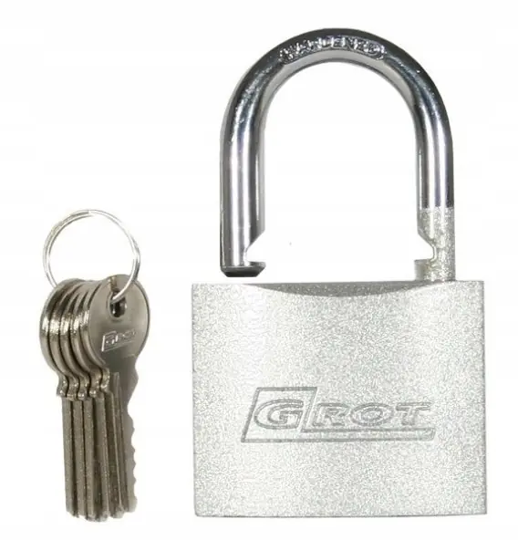 solidna metalowa obudowa, hartowany i chromowany pałąk, obracany o 360 stopni, zabezpieczenie przed intruzami ANTIPICK PIN, mechanizm wykonany z elementów mosiężnych i nierdzewnych, w komplecie 5 szt. niklowanych kluczy