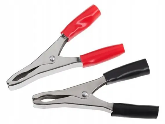 Dane techniczne: Prąd znamionowy: 50A Długość: 98mm Rozwarcie szczęk: 28mm Materiał: stalowe Krokodylki – zaciski szczękowe mogą być stosowane w różnego rodzaju połączeniach elektrycznych, prostownikach, kablach rozruchowych i ładowarkach akumulatorów. Złącze krokodyl ( 1 szt.) – czarne ** Prezentowane zdjęcie pełni funkcję poglądową.