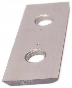 Opis przedmiotu: |||Nazwa: Płytka wymienna MG18 |||Ilość sprzedawana: 1 szt. |||Rozmiar: 30x12x1,5 (L x H x K) |||Materiał: Węglik MG18 OPIS PRODUKTU: |||Węglik o idealnej strukturze przeznaczonej do obróbki drewna twardego i klejonego |||Płytki wymienne wykonane z węglika spiekanego do fazowania i frezowania o symbolu twardości MG18. |||Idealnie sprawdza się przy pracy w: |||- drewnie liściastym, suchym |||- drewnie liściastym, mokrym |||- MDF |||- Płyta wiórowa DANE TECHNICZNE: |||Długość (L) – 30mm |||Szerokość (H) – 12mm |||Grubość (K) – 1,5mm |||Kąt nachylenia ostrza (A) – 35 st. |||Średnica otworów – 4 |||Rozstaw otworów – 14