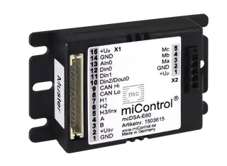 |||Podatek VAT:23%|||Waga:0,1000 kg|||Symbol:1512015|||EAN:20165628|||Wysokość:0 cm|||Długość:0 cm|||Szerokość:0 cm|||Napięcie logiki :9..30|||Sterownik silnika DC :TAK|||Sterownik silnika BLDC :TAK|||Napięcie wyjściowe:100% Up|||Silnik Liniowy :TAK|||Silnik Krokowy :NIE|||CAN bus :TAK (DS301, DS402)|||Czujnik Halla :NIE|||Funkcja STO :NIE|||Temp. pracy [°C] :-25..40 °C|||EtherCAT :NIE|||Klasa IP :IP20|||Waga [g] :100 g|||Seria: :E5x|||Wejścia cyfrowe :8 (Din0..7)|||Wyjścia cyfrowe :4 (Dout0..3)|||Wymiary :78 x 74 x 28 mm|||Wejścia analogowyowe :3 (Ain0..2)|||Prąd wyjściowy (ciągły) :10|||Seria :E5x|||Napięcie zasilania [V] :9..60|||Prąd maksymalny [A]:50|||Obsługa enkodera :TAK|||Waga [g] :100 g|||Producent :MiControl|||Producent:MiControl|||Seria:E5x|||Napięcie zasilania silnika:9-60 V|||Napięcie zasilania logiki:9-30 V|||Prąd znamionowy :9 A |||Prąd maksymalny:50 A|||Typ obsługiwanych silników:DC / BLDC / silniki liniowe|||Tryb sterowania:momentowe / prędkościowe / pozycyjne|||Komunikacja sieciowa:CANopen|||Interfejs komunikacyjny :CAN|||I/O:8DI / 4DO / 3AI|||Sprzężenie zwrotne:Enkoder SIN/COS|||Funkcje bezpieczeństwa:NIE|||Hamowanie dynamiczne:NIE|||Sterownik programowalny:TAK