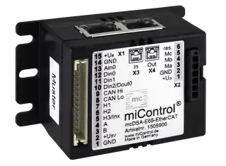 |||Podatek VAT:23%|||Waga:0,0180 kg|||Symbol:1503571|||EAN:20165529|||Wysokość:0 cm|||Długość:0 cm|||Szerokość:0 cm|||Napięcie logiki :9..30|||Prąd ciągły 24V :5|||Sterownik silnika DC :TAK|||Sterownik silnika BLDC :TAK|||Prąd ciągły 48V :4,3|||Napięcie wyjściowe:100% Up|||Silnik Liniowy :TAK|||Silnik Krokowy :NIE|||CAN bus :TAK (DS301, DS402)|||Czujnik Halla :TAK|||Funkcja STO :NIE|||Temp. pracy [°C] :-40..55 °C|||EtherCAT :NIE|||Klasa IP :IP00|||Waga [g] :18 g|||Seria: :E6x|||Wejścia cyfrowe :3 (Din0..2)|||Wyjścia cyfrowe :2 (Dout0..1)|||Wymiary :52.5 x 41 x 11 mm|||Wejścia analogowyowe :2 (Ain0..1)|||Seria :E6x|||Napięcie zasilania [V] :9..60|||Prąd maksymalny [A]:15|||Obsługa enkodera :TAK|||Waga [g] :18 g|||Producent :MiControl|||Producent:MiControl|||Seria:E6x|||Napięcie zasilania silnika:9-60 V|||Napięcie zasilania logiki:9-30 V|||Prąd znamionowy :4,3 A|||Prąd maksymalny:15 A|||Typ obsługiwanych silników:DC / BLDC / silniki liniowe|||Tryb sterowania:momentowe / prędkościowe / pozycyjne|||Komunikacja sieciowa:CANopen|||Interfejs komunikacyjny :CAN|||I/O:3DI / 2DO / 2AI|||Sprzężenie zwrotne:cz. HALLA / enkoder inkrementalny|||Funkcje bezpieczeństwa:NIE|||Hamowanie dynamiczne:NIE|||Sterownik programowalny:TAK